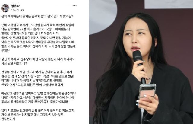 또한, 정유라는 "계엄이란 단어 하나에 꽂혀서 공산주의라고 거품 무는 게 공산주의가 아니라 냅다 지르고는 안 그런 척 불리하게 상황 돌아가면 저는 그저 가수, 배우예요 하고 매번 그 꼴 보는 것도 한두 번이지. 연예인이니까 목소리를 내는 거? 연예인들은 찾아보지도 않고 매번 선동에 휘말려 다른 사람의 의견에 직간접적으로 영향을 줄 수 있는 존재가 질러 놓고 책임은 안 지더라"라고 비난했습니다.