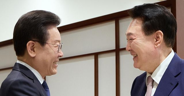 윤석열 대통령이 지난 4월 29일 용산 대통령실에서 열린 영수 회담에 앞서 집무실에 도착한 이재명 더불어민주당 대표를 맞이하며 악수하고 있다. / 뉴스1