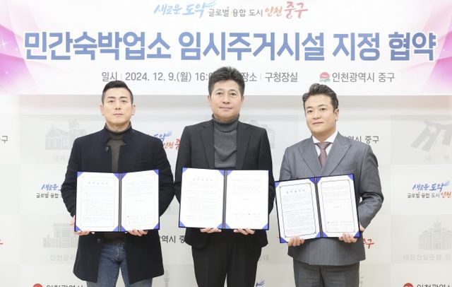 구는 이를 위해 지난 9일 중구청 구청장실에서 관내 민간숙박업소 3곳과 이 같은 내용을 골자로 한 ‘민간숙박업소 임시주거시설 지정 협약’을 체결했다.