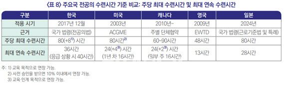 주당 최대 수련시간은 교육 목적일 때 최대 8시간 연장할 수 있어 사실상 88시간까지 가능하다. 최대 연속 수련시간은 36시간, 응급 상황 발생 시에는 40시간까지 가능해, 주요국에서 교육과 인계 목적으로 연장하는 경우일 때 최대 28시간인 점을 고려하더라도 훨씬 높은 수준이다.