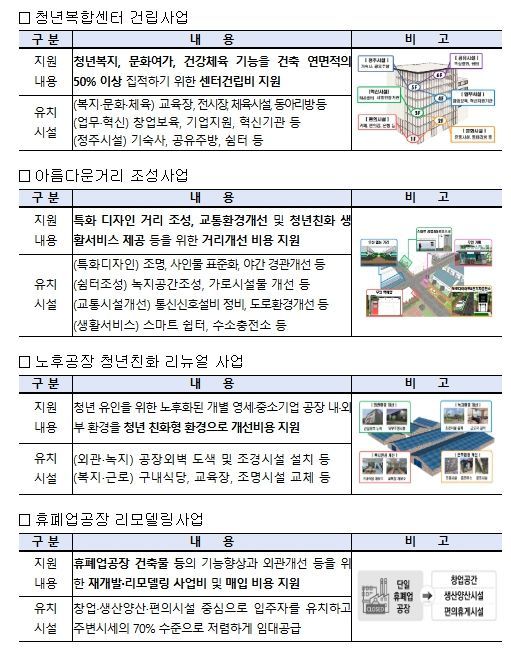 이에, 산업부는 낙후된 산업단지를 청년이 찾는 매력적인 공간으로 전환하기 위해 민간대행사업(’10~), 산업단지환경개선펀드(’11~), 정부출연사업(’15~) 등 다양한 방식의 구조고도화 사업을 추진해왔다. 특히, ’15년부터 추진한 정부출연사업으로 224개 사업에 총 1조 3천억원을 투자하여 복지·문화·편의시설 확충, 노후 공장 환경개선, 휴폐업공장 리모델링 등을 지원했다. ’24년에는 청년문화센터 30개, 아름다운거리 조성 30개, 휴폐업공장 리모델링 2개, 노후공장 청년친화 리뉴얼 15개 등 전년보다 대폭 증가한 총 77개 신규사업을 선정했다.