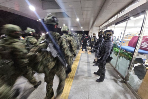 윤석열 대통령이 긴급 대국민 담화를 통해 비상계엄령을 발표한 가운데 4일 서울 여의도 국회 입구를 계엄군이 통제하고 있다./사진=뉴시스