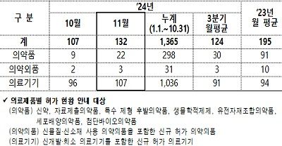 11월 의료제품 허가 품목 수는 지난해 월평균(195개) 대비 67.7%, 올해 3분기 월평균(124개) 대비 106.5% 수준이었다.