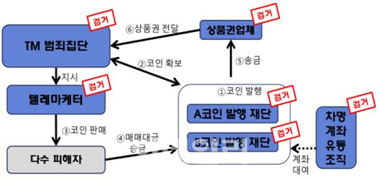 이들 조직은 텔레마케팅 업체 운영자 A씨를 중심으로 투자 리딩방을 운영했다. 여기에 가치가 없는 가상자산을 넘긴 발행재단 관련자와 범죄수익 은닉에 협조한 상품권 업체, 대포통장 유통조직 관계자들까지 60여 명이 가담한 것으로 확인됐다.