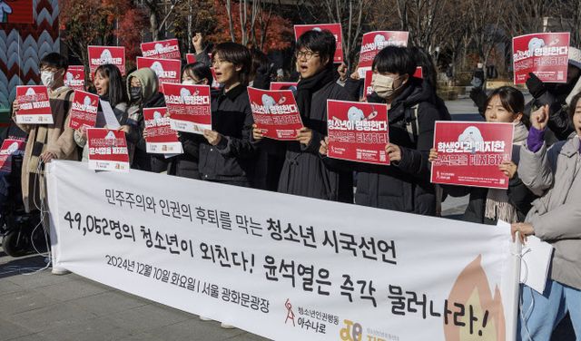 청소년인권운동연대 지음·청소년인권행동 아수나로는 10일 서울 광화문 광장에서 ‘민주주의와 인권의 후퇴를 막는 청소년 시국선언’ 기자회견을 개최했다. 이번 시국선언에 청소년 4만9052명, 비청소년 950명,지지 단체 123곳이 동참했다. 이들은 “대통령 퇴진을 요구하는 청소년 시국선언 규모가 5만명 이상을 돌파한 것은 사상 최초로 유례가 없던 일”이라며 “윤 대통령에 대한 분노가 얼마나 큰지 느낄 수 있었다”고 설명했다.