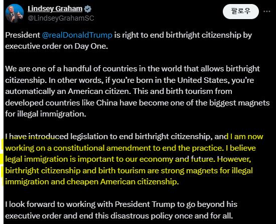 앞서 트럼프 당선인은 부모 중 한 명이 미국 시민이거나 영주권자여야만 미국 시민이 될 수 있도록 하는 행정명령에 서명하겠다고 밝힌 바 있다.