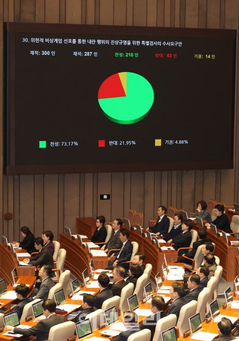 국회는 10일 본회의를 열고 ‘위헌적 비상계엄 선포를 통한 내란 행위의 진상 규명을 위한 특별검사의 수사요구안(내란 행위 상설특검 요구안)’을 통과시켰다. 재석 의원 287명 중 찬성 210표, 반대 63표, 기권 14표였다.