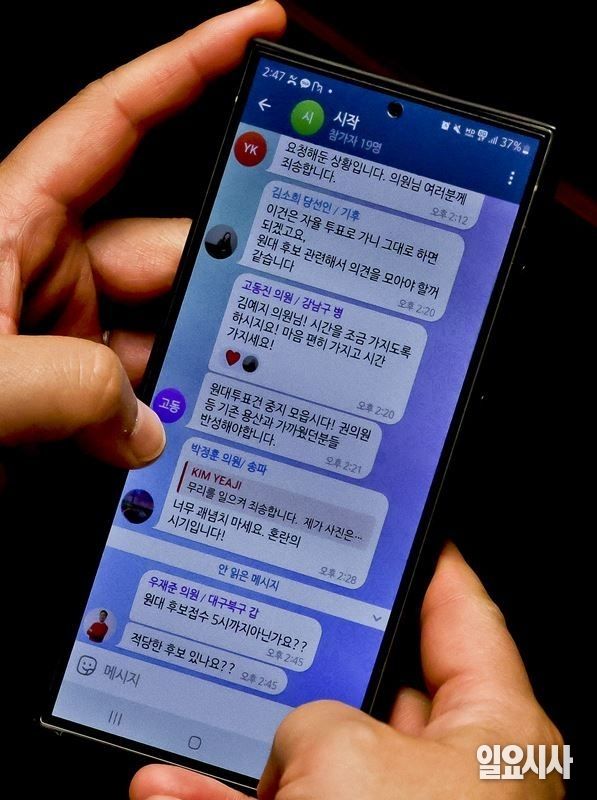 대부분 초선 위주인 친한계도 밀리지 않겠다는 입장이다. <일요시사는> 국민의힘 진종오 의원의 휴대전화 화면을 통해 일부 친한계 의원으로 구성된 텔레그램 그룹 채팅 내용을 확인했다.