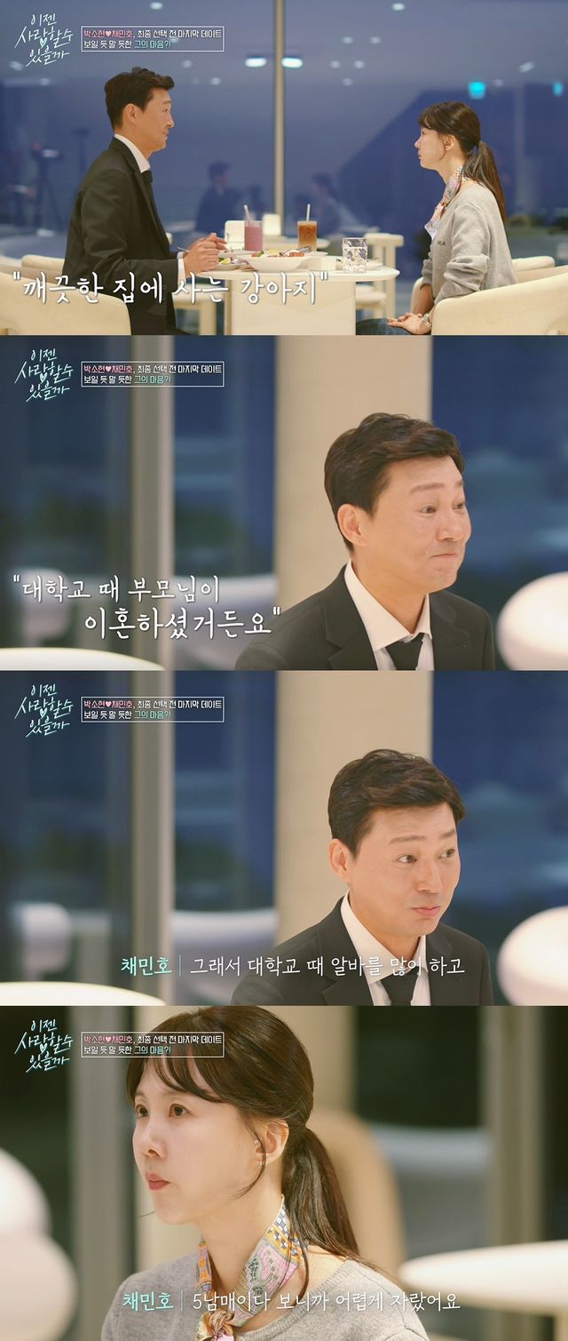9일 방송된 tvN STORY '이젠 사랑할 수 있을까'(이하 '이젠사랑')에서는 박소현과 채민호가 마지막 데이트에서 솔직한 속내를 드러내는 모습이 전파를 탔다.