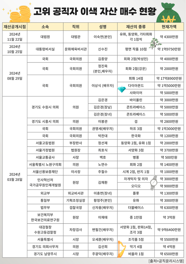 보유한 예술 작품의 평가총액이 수억원대에 달하는 고위 공직자도 더러 있었다. 올해 10월 기준 신수진 대통령비서실 문화체육비서관은 평면 작품 10점을 보유하고 있는데 이들 작품의 총 평가액은 무려 2억원에 달했다. 이상식 더불어민주당 국회의원 역시 올해 8월 기준 배우자 명의로 회화 14점을 소유하고 있다. 회화 14점의 평가총액은 약 18억원에 달했다. 이들 작품 중에는 10억원 이상의 평가액을 가진 이우환 작가의 회화도 포함돼 있다. 이우환 작가는 현재 국내 미술시장에서 생존 작가 가운데 최고 '블루칩'으로 꼽히는 화백이다.