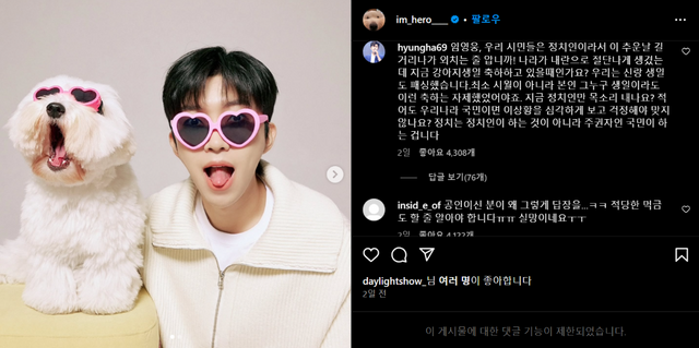 가수 겸 배우로 활동하고 있는 차은우도 이시국 씨들의 표적이 됐다. 지난 주말 개인 SNS에 본인 화보사진을 여러 장 공개했다. 이를 본 일부 누리꾼들은 "이 시국에 인스타를 올릴 때냐? 국회로 나와라", "이 시국에 제정신이냐"는 등의 댓글이 이어지고 있다.