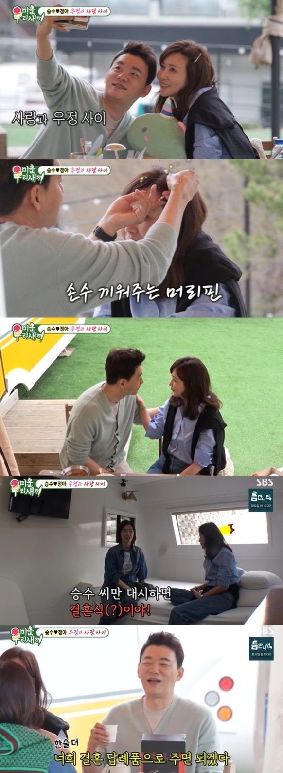 김승수는 SBS '미운 우리 새끼'에서 양정아와 백허그하고 스티커 사진을 찍는가 하면 인형과 머리핀, 프러포즈 때나 볼 법한 목걸이 선물을 하는 등 미묘한 분위기를 풍겼다.
