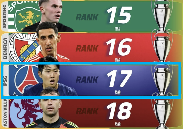 18위를 차지할 것으로 예상된 PSG의 현 상황은 그리 좋지 않다. 5라운드를 기준으로 PSG는 1승 1무 3패를 기록, 플레이오프권 밖인 25위로 밀려나 있다. 남은 RB잘츠부르크전과 맨체스터 시티전, 그리고 슈투트가르트전에서 좋지 않은 결과를 얻는다면 플레이오프 진출도 장담하기 힘든 상황이다.