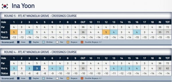 수석을 기대했던 윤이나는 이날 버디 3개, 보기 2개로 1타를 줄여 합계 15언더파 343타(67-76-67-62-71)를 쳐 단독 8위를 차지했다. 윤이나는 4라운드에서 10타를 몰아쳤으나 최종일 아쉽게 타수를 1타밖에 줄이지 못했다.