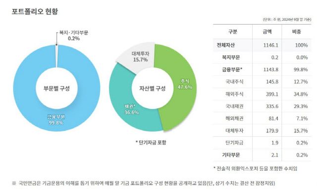 국민연금공단은 전체 포트폴리오에서 국내주식 투자 비중이 지난 9월 말 기준 12.7%(145조8000억원)를 차지한다.