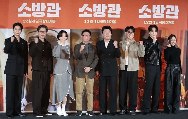 배우 주원(왼쪽부터)과 유재명, 이유영, 곽경택 감독, 김민재, 오대환, 이준혁, 장영남이 지난달 8일 서울 용산구 CGV 용산아이파크몰에서 열린 영화 '소방관'(감독 곽경택) 제작보고회에서 포즈를 취하고 있다. / 뉴스1