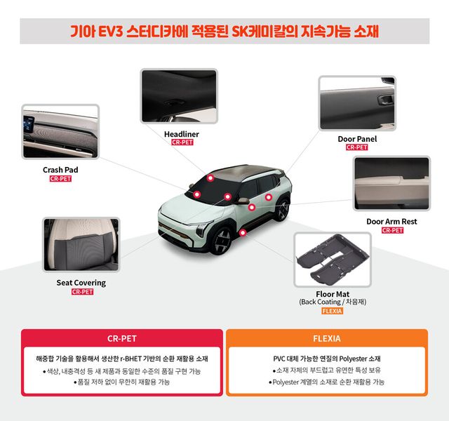 [M투데이 임헌섭 기자] SK케미칼은 최근 현대차·기아 AVP본부 기초소재연구센터와 순환 재활용 및 바이오 소재를 이용한 자동차 부품 6종을 기아 'EV3 스터디카'에 적용했다고 11일 밝혔다.