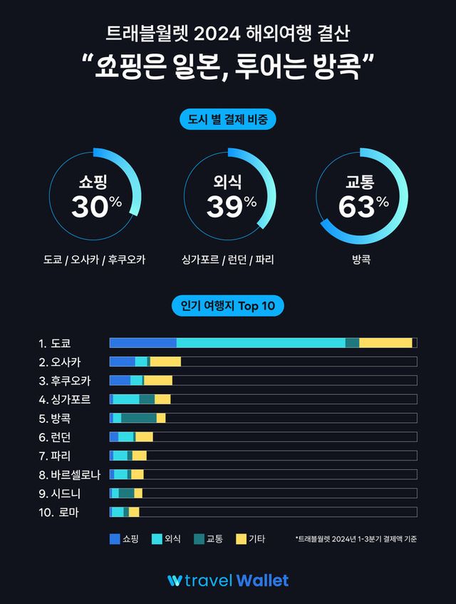 트래블월렛은 11일 2024년 해외여행 트렌드를 발표했다. 연말연시를 맞아 해외여행 수요가 급증하는 가운데, 트래블월렛이 올해 1~3분기 트래블페이 결제 데이터를 분석한 결과, 일본이 가장 인기 있는 여행지로 꼽혔다. 특히 도쿄, 오사카, 후쿠오카 순으로 가장 많은 여행객의 선택을 받았으며, 다음으로 싱가포르와 방콕, 런던, 파리, 바르셀로나, 시드니, 로마가 주목할 만한 여행지로 나타났다. 방콕은 날씨가 선선해지는 3분기에 수요가 집중되는 특징을 보였다.