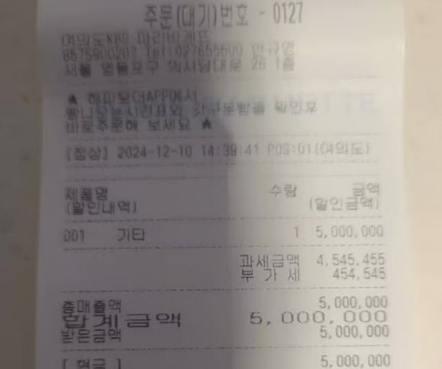 공개된 사진에는 이날 오후 2시 39분 파리바게뜨 여의도KBS점에서 500만원이 현금 결제된 영수증이 담겼다. 파리바게뜨 따뜻한 아메리카노(3000원) 기준 약 1666잔에 달하는 금액이다.