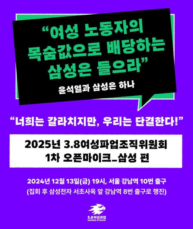 2025년 3.8여성파업조직위원회는 2024년에 이어 3.8 여성파업을 조직하고 준비하고 있다. 이를 위해 '찾아가는 여성파업', '간담회', '토론회' 등 여러 사업을 진행하고 있다. '오픈마이크'도 그중 하나로 오는 12월 13일 저녁 7시 서울지하철 2호선 강남역 10번 출구에서 1차 오픈마이크_삼성편을 펼친다. 삼성전자 서초사옥 가까이에 있는 강남역 10번 출구에서 이번 오픈마이크를 여는 이유는 윤석열과 함께 대한민국 최대 기업이라 할 수 있는 삼성에 최근의 국정 혼란과 구조적 성차별에 대한 책임을 묻기 위해서다. 또한 강남역 10번 출구는 2016년 정말 안타깝게도 강남역 인근 화장실에서 묻지마 여성 살해 사건이 벌어진 후 추모의 공간이 된 곳이기도 하다. 삼성전자는 12월 말 4차 배당일을 앞두고 있다. 2025년 3.8여성파업조직위원회는 이번 오픈마이크를 통해 여성 노동자의 목숨값으로 배당을 하는 삼성에, 이를 비호한 윤석열 정권에 여성 노동자의 목소리와 힘을 보여주고자 한다.