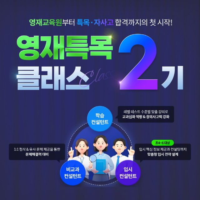 영재특목 클래스에 선발되면 수학 레벨테스트로 학생의 실력을 분석한 후, 초등 심화 역량부터 중등 교육과정까지 최상위 실력을 키울 수 있는 맞춤학습 시간표를 제공한다. EBS, 목동, 대치동 출신의 최정예 강사진과 과목별 교육 전문가들이 모여 수준 높은 콘텐츠를 제공하고 있다.