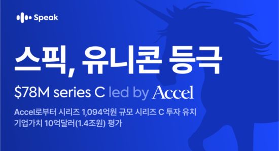 AI 기반 영어 학습 솔루션 ‘스픽(Speak)’을 운영하는 스픽이지랩스코리아(대표 코너 니콜라이 즈윅)가 시리즈 C 투자 라운드에서 약 1,094억 원(7,800만 달러)을 유치하며 유니콘 기업으로 진입했다고 11일 밝혔다.