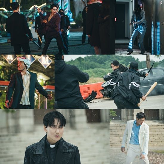 먼저 ‘열혈사제’의 의인화 김해일 역 김남길은 분장과 쏟아지는 물줄기에서도 흐트러짐 없는 칼 각 액션을 선보여 명불허전의 면모를 다시금 일깨웠다. 조커 분장을 하고 진행한 지림랜드 액션 장면에서 김남길은 조금이라도 더 환상적인 장면을 만들어내기 위해 다양하게 합을 맞추는 리허설을 진행했고, 우마성당에서 촬영한 빗속 액션 때에는 결연한 표정을 유지해 긴장감을 치솟게 했다.