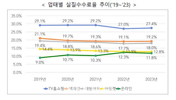 작년 기준 업태별 실질수수료율은 △TV홈쇼핑 27.3% △백화점 19.2% △대형마트 18.0% △아울렛·복합쇼핑몰 12.8% △온라인쇼핑몰 11.8% 순으로 집계됐다. TV홈쇼핑과 백화점, 대형마트는 각각 전년보다 0.4%포인트, 0.1%포인트, 0.3%포인트 올랐고 아울렛·복합쇼핑몰과 온라인쇼핑몰은 각각 0.1%포인트, 0.5%포인트 하락했다.