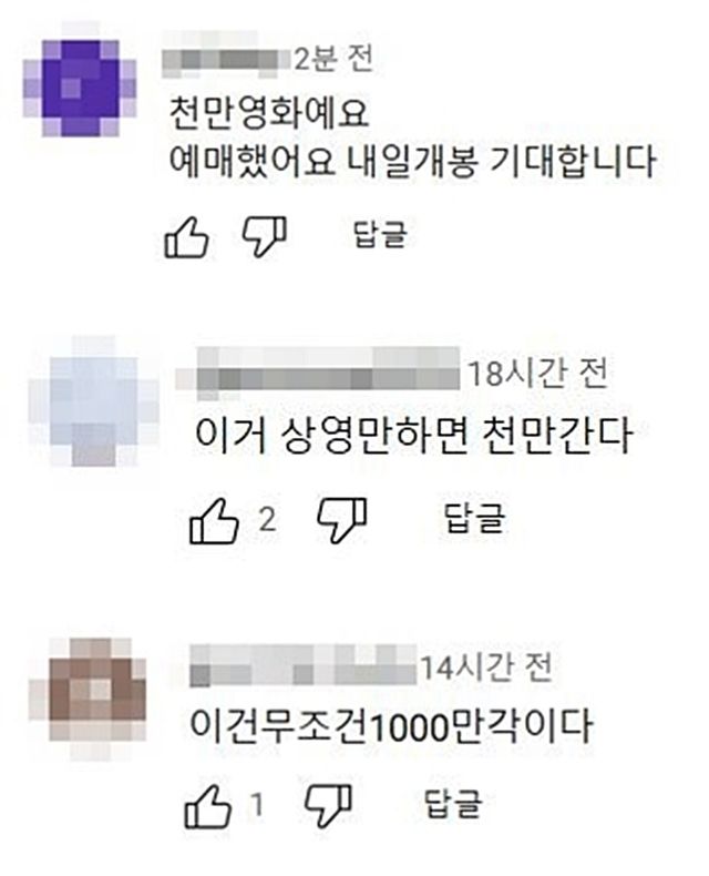 다른 네티즌들도 "이거 상영만 하면 천만 간다" "이건 무조건 1000만 각이다" "천만 영화입니다. 예매했습니다. 내일 개봉 기대합니다" "꼭 보러 갑니다. 천만 가즈아!" 등의 댓글을 달았다.