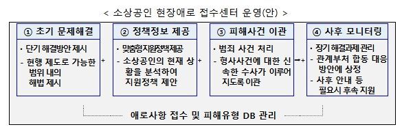 아울러, 중소벤처기업부는 오늘부터 13개 지방중소벤처기업청 및 77개 소상공인시장진흥공단 지역센터 등과 함께'소상공인 현장애로 접수센터'를 본격 가동한다. 접수센터를 통해 소상공인들의 생업 피해와 관련한 다양한 현장애로를 수렴하고, 수사가 필요한 사건에 대해서는 치안당국에 적극적으로 이관할 계획이다.