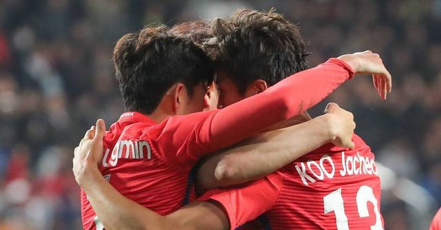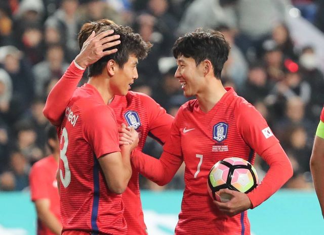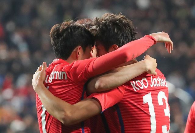 2017년 11월 14일 울산 문수경기장에서 열린 한국 대 세르비아 축구대표팀 평가전 경기 후반전에서 구자철이 패널티킥을 얻어낸 뒤 손흥민과 기뻐하고 있다 / 뉴스1