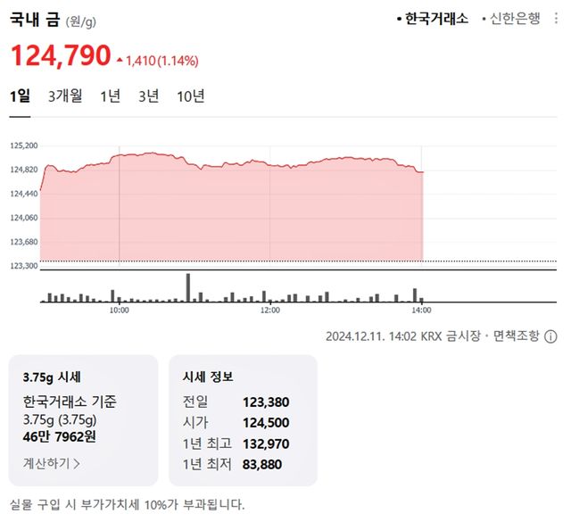 국내 금시세(금값)가 11일 오후 상승세(전 거래일 대비)를 보이고 있다.