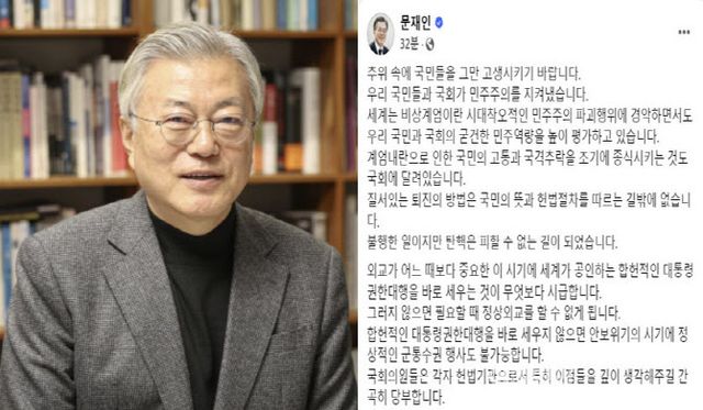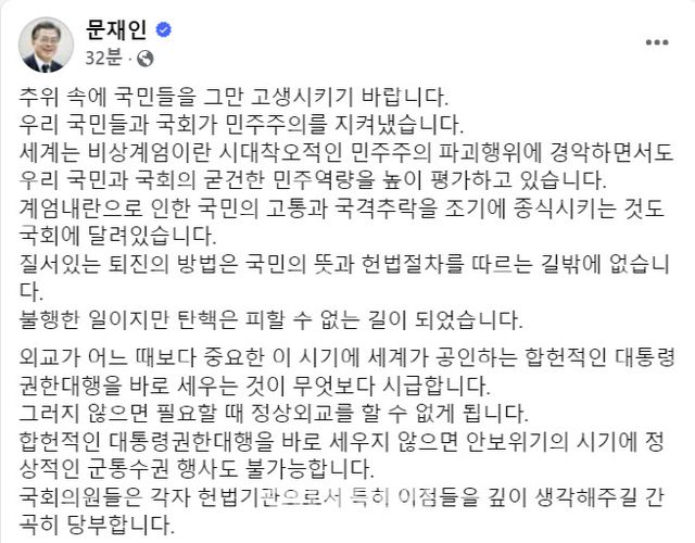 문 전 대통령은 이날 오후 사회연결망서비스(SNS)를 통해 12·3 비상 계엄 사태와 관련해 “추위 속에 국민들을 그만 고생시키기 바란다”면서 “우리 국민들과 국회가 민주주의를 지켜냈다”고 밝혔다.