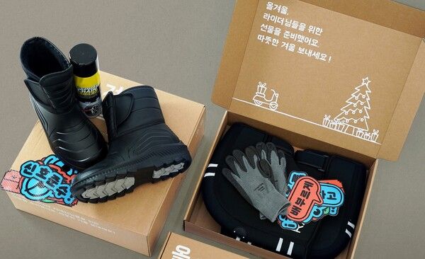 올해 우아한청년들 혹한기 안전용품 지원사업에서는 ▲방한화(슈퍼카미트) ▲바라클라바(락브로스) ▲방한장갑(락브로스) ▲패딩바지·방상내피 세트 ▲방한 무릎보호대 ▲카본 방한 핸들토크(블루샤크) 등이 제안됐다.