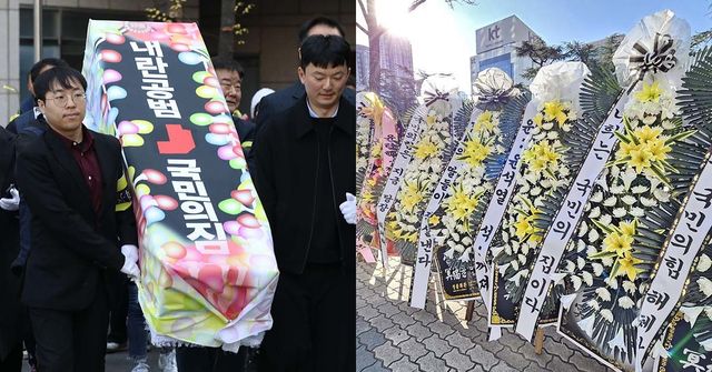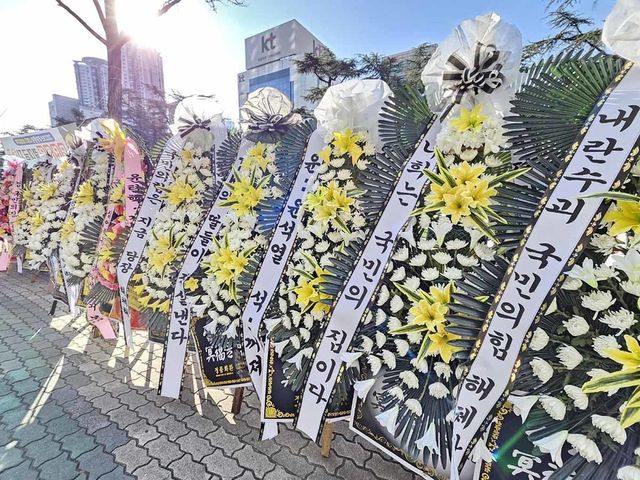 윤석열 대통령 탄핵소추안 재표결을 사흘 앞둔 11일 오후 대구 수성구 범어동 국민의힘 대구시당 당사 앞 인도에 국민의힘과 여당 국회의원을 규탄하는 근조 화환 20여개가 놓여 있다. / 뉴스1