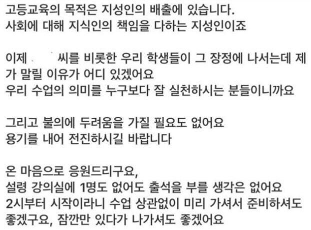 서울의 한 대학의 한 철학과 교수 A씨는 “불의에 두려움을 가질 필요도 없다. 용기를 내 전진하시길 바란다. 온 마음으로 응원 드린다”며 “설령 강의실에 1명도 없어도 출석을 부를 생각은 없다. 2시부터 시작이라고 하니 수업과 상관없이 미리 가셔서 준비하셔도 좋겠고, 잠깐 있다가 나가도 좋겠다”는 내용의 메일을 학생에게 회신했다.