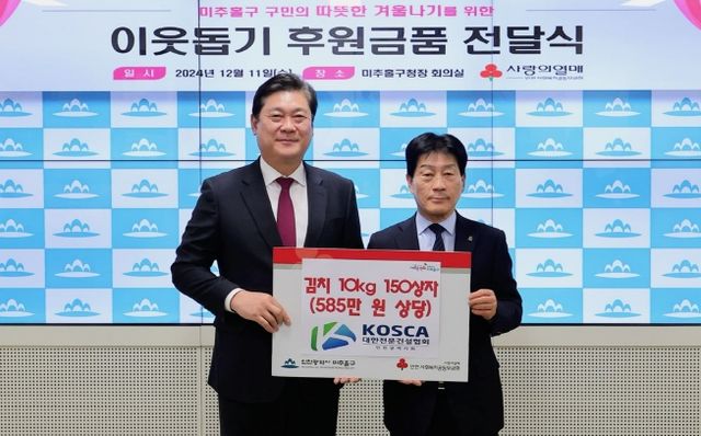 [파이낸셜경제=김영란 기자] 인천 미추홀구는 11일 구청장실에서 대한전문건설협회 인천광역시회로부터 관내 저소득층을 위한 김장 김치 10kg 150상자(585만 원 상당)를 전달받았다.