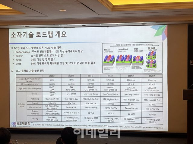 양준모 나노기술종합원 박사는 11일 인터컨티넨탈 서울 파르나스 호텔에서 열린 ‘반도체 기술 로드맵 포럼’에서 이렇게 말했다. 양 박사는 “2030년부터 반도체는 미세화의 한계에 도달할 것”이라며 “공정기술과 설계를 공조해서 개발해야 한다”고 내다봤다. 그는 현재 인공지능(AI) 시장을 이끄는 고대역폭메모리(HBM)의 경우 2040년엔 36단 제품까지 개발될 것으로 전망했다.