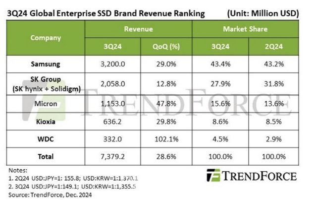 트렌드포스는 “고용량 모델에 대한 수요는 엔비디아의 H 시리즈 제품 출시와 AI 트레이닝 서버에 대한 지속적인 주문에 힘입어 강세를 보였다”며 “그 결과 기업용 SSD의 총 조달량은 전 분기 대비 15% 증가했다”고 설명했다.