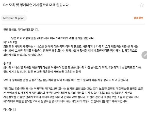 신상이 유출된 피해자들은 메디스태프가 강제로 회원탈퇴를 시켜 사태를 악화시켰다고 주장하며, 신상정보 유출을 방치해 개인정보보호법을 위반했다고 지적했다. A씨는 “실명이 언급된 명예훼손 글을 여러 번 신고했지만, 갑자기 계정이 정지됐다는 문자를 받았다”며 “명예훼손 글 작성자는 방치하면서 신고한 사람만 정지시키는 것이 이해가 가지 않는다”고 억울함을 토로했다.