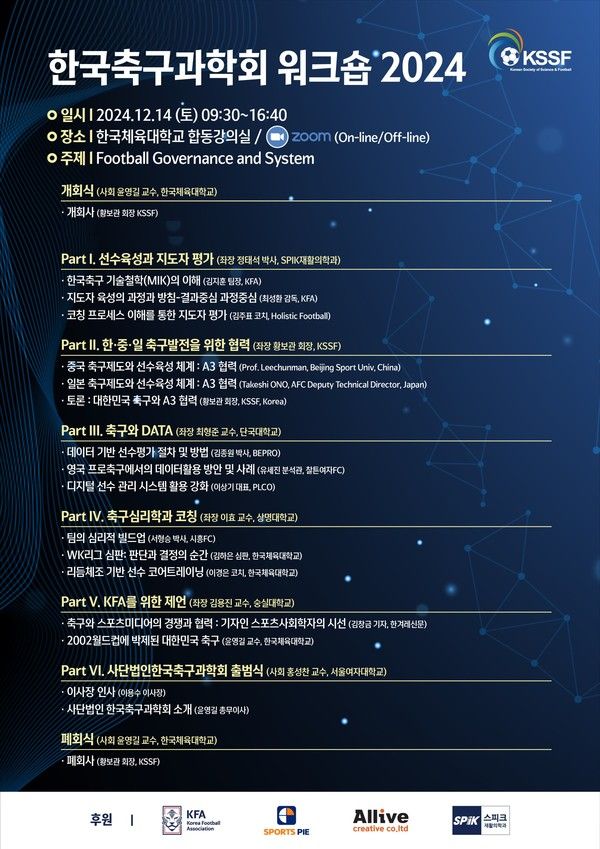 대한민국 축구의 현재와 미래, 발전 방향을 논의하는 '한국축구과학회 워크숍 2024'가 오는 12월 14일 토요일 오전 9시 30분부터 한국체육대학교 합동강의실에서 온·오프라인으로 개최된다. 주제는 'Football Governance and System(축구 협치와 체계)'이다.