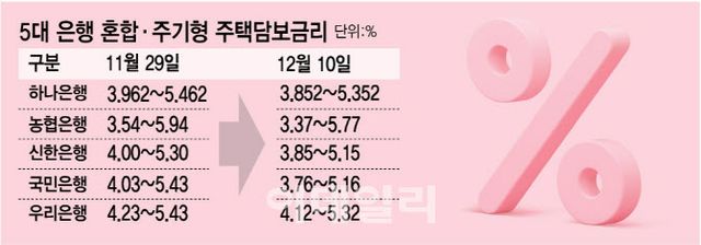 지난달 4주차(11월 29일 기준) 대비 이날 은행들의 혼합·주기형 주택담보금리는 하나은행 3.962~5.462%→3.852~5.352%, 농협은행 3.54~5.94%→3.37~5.77%, 신한은행 4.00~5.30%→3.85~5.15%, 국민은행 4.03~5.43→3.76~5.16%, 우리은행 4.23~5.43%→4.12~5.32% 등으로 금리 하단 기준 0.11~0.26%포인트 떨어졌다.