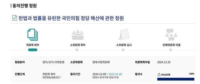 한편 지난 9일 국회 국민동의 청원 게시판에 '헌법과 법률을 유린한 국민의힘 정당 해산에 관한 청원'이 올라왔다. 이날 오후 2시 25분 기준 24만 1000명이 동의했다.