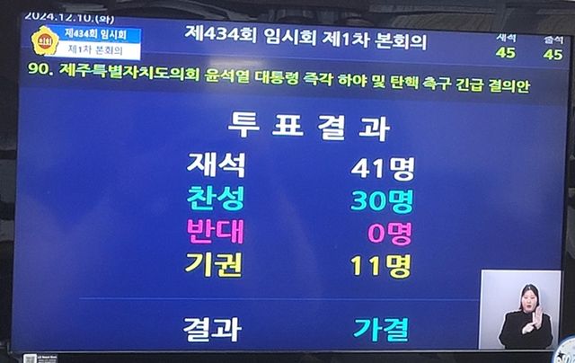 제주도의회 윤석열 대통령 즉각 하야 및 탄핵 촉구 긴급결의안 투표 결과. 연합뉴스 제공