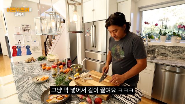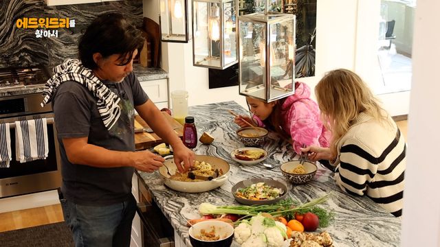 아빠가 만든 음식 말고 좋아하는 음식으로 아든이 꼽은 건 ’라면‘. 곧바로 에드워드 리는 라면을 준비하기 시작한다. 라면 하나에도 그의 요리 철학이 엿보인다. ”라면같은 면요리를 할 때 육수는 제가 만들어요. 손질하다가 남은 재료도 다 포함해서 만들죠. 이렇게 남은 채소나 과일을 막 넣어서 같이 끓이는 거죠.“ 각종 채소를 넣고 요리의 화룡점정인 ’된장‘까지 더해주면 에드워드 리의 ’특제 된장 채소 라면‘이 완성된다. ’흑백요리사‘ 준우승자이자 누구에게나 호평받는 요리사지만 냉정한(?) 평가자인 아내 다이앤과 딸 아든에겐 당부의 말을 덧붙인다. ”잊지 마. 맛없어도 웃으면서 이렇게 말해주기! “음~ 맛있다!”라고 말이지.“