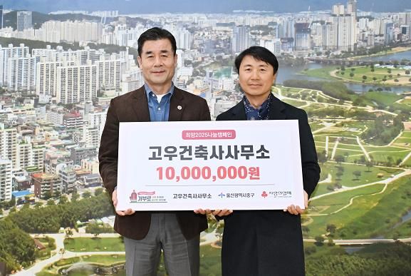[파이낸셜경제=김예빈 기자] 고우건축사사무소가 12월 11일 오후 3시 30분 중구청 구청장실을 찾아 울산사회복지공동모금회를 통해 이웃돕기 후원금 1,000만 원을 전달했다.