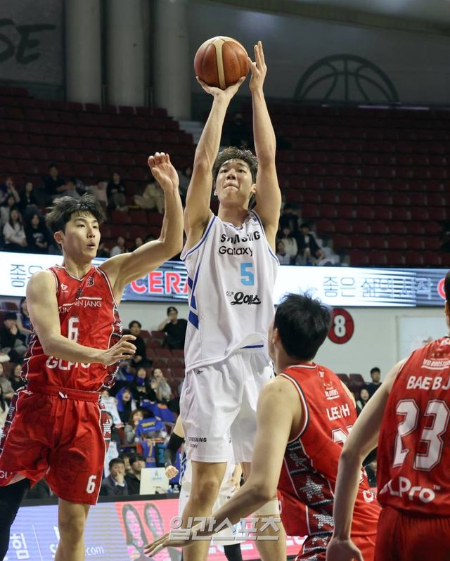 삼성 이원석이 정관장 수비에 앞서 슛하고있다.