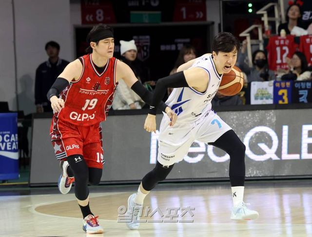 삼성 최성모가 정관장 을 따돌리고 드리블 하고있다.