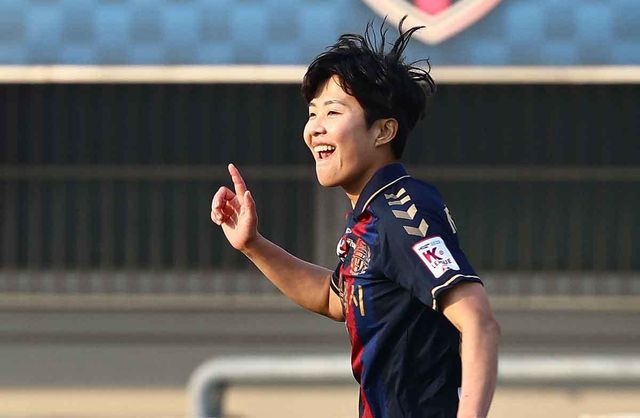 2023년 11월 19일 오후 경기 수원종합운동장에서 열린 2023 여자실업축구 WK리그 챔피언결정전 1차전 수원FC 위민과 인천현대제철 레드엔젤스의 경기에서 수원FC 지소연이 역전골을 넣은 뒤 세리머니하고 있다. / 뉴스1