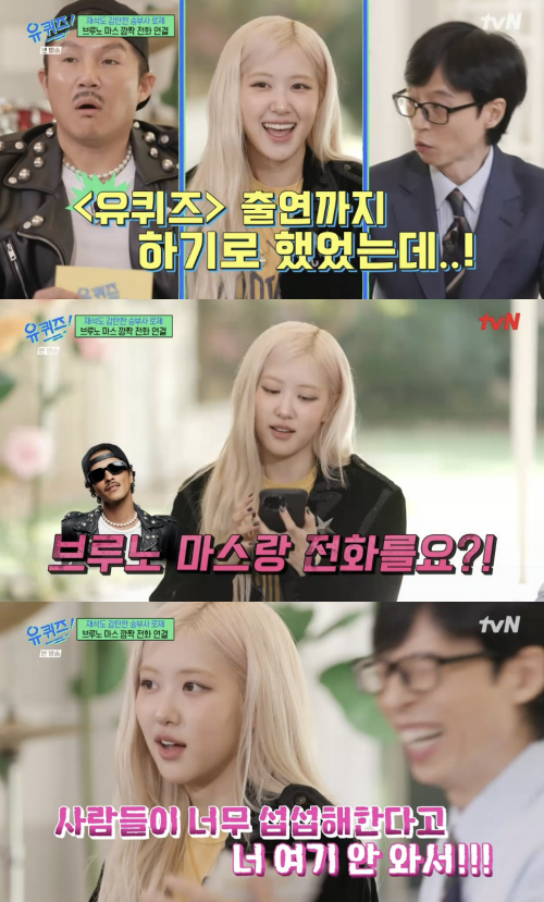그룹 블랙핑크 로제가 브루노 마스의 ‘유퀴즈’ 출연을 적극 추진하려 했다고 밝혔다.